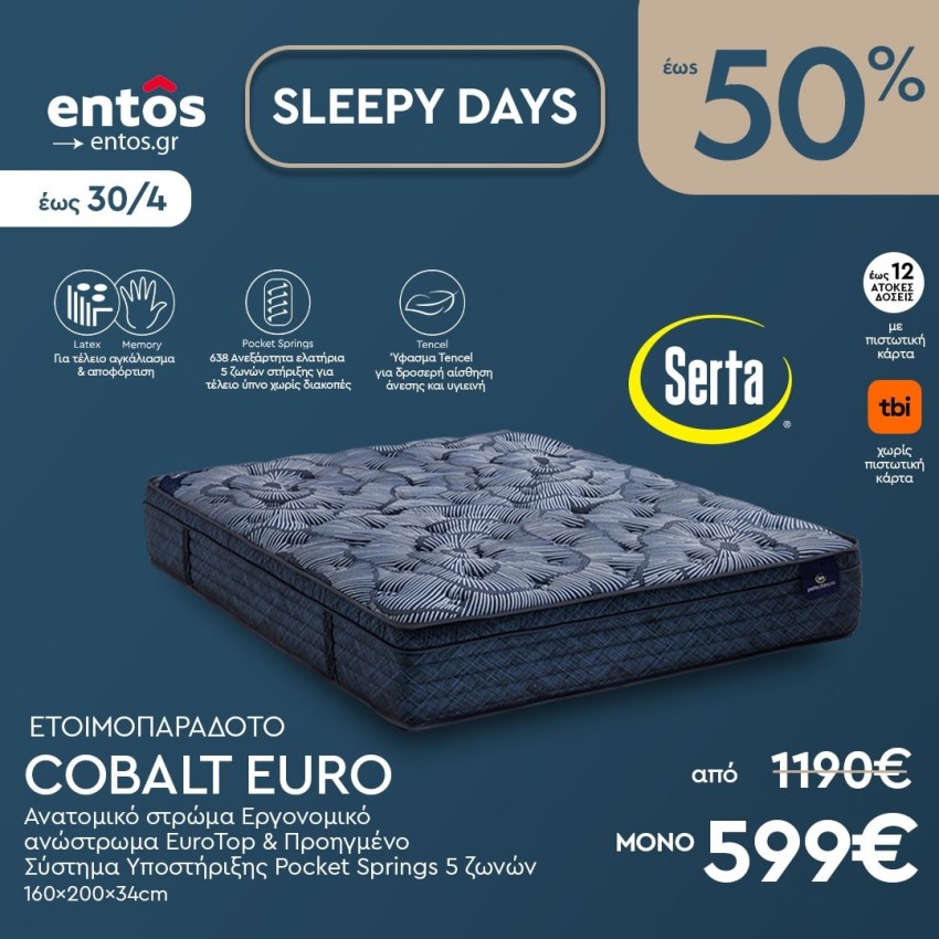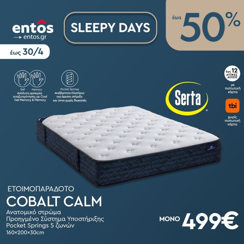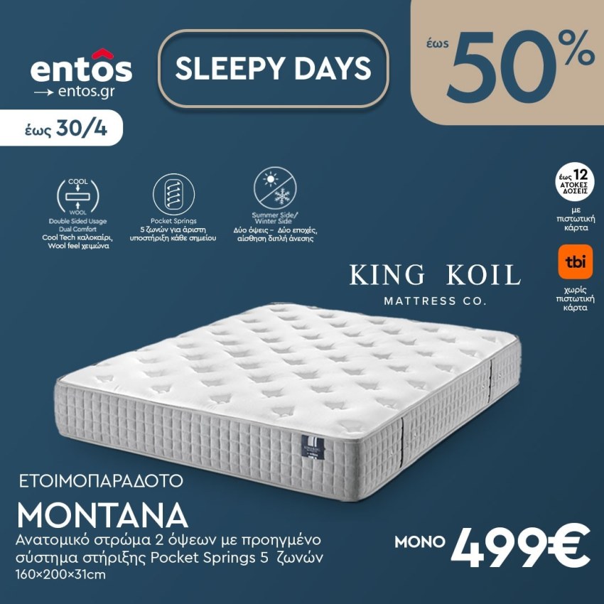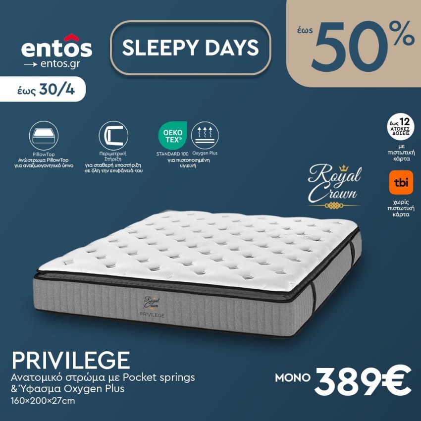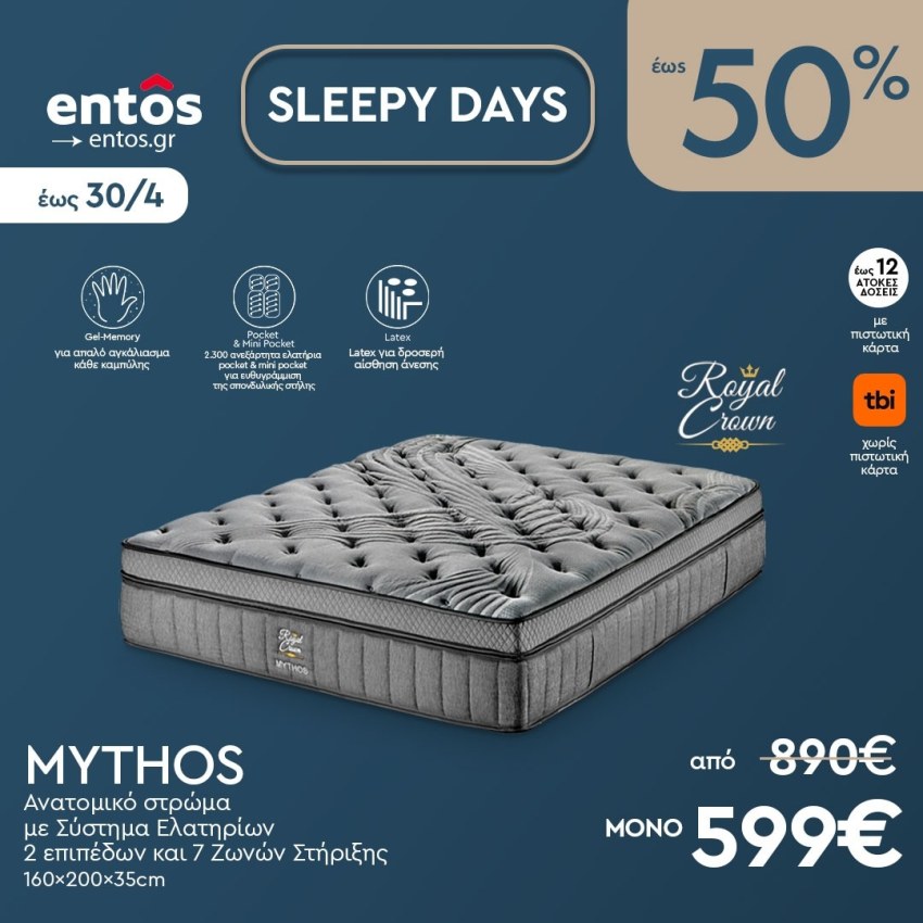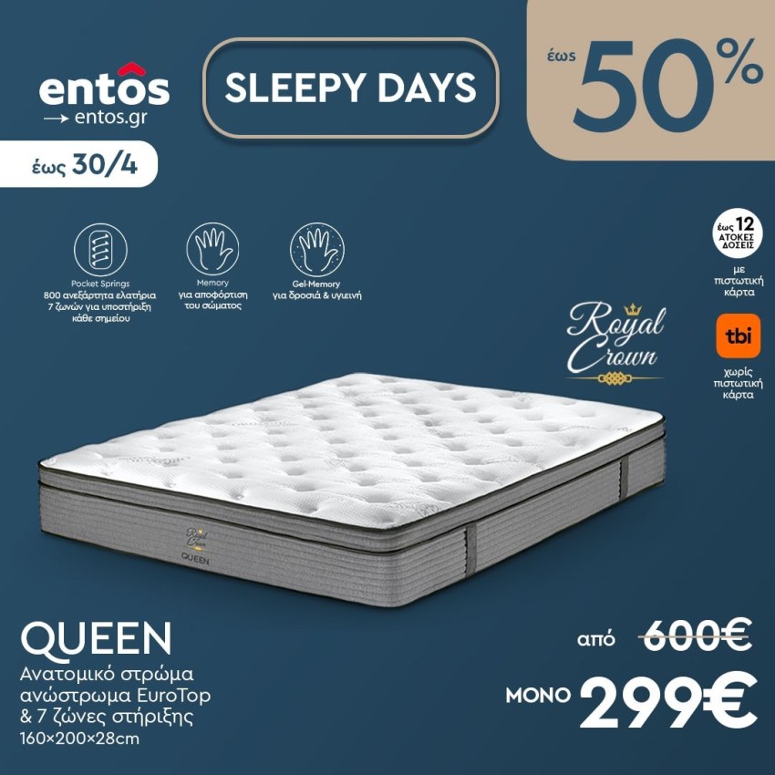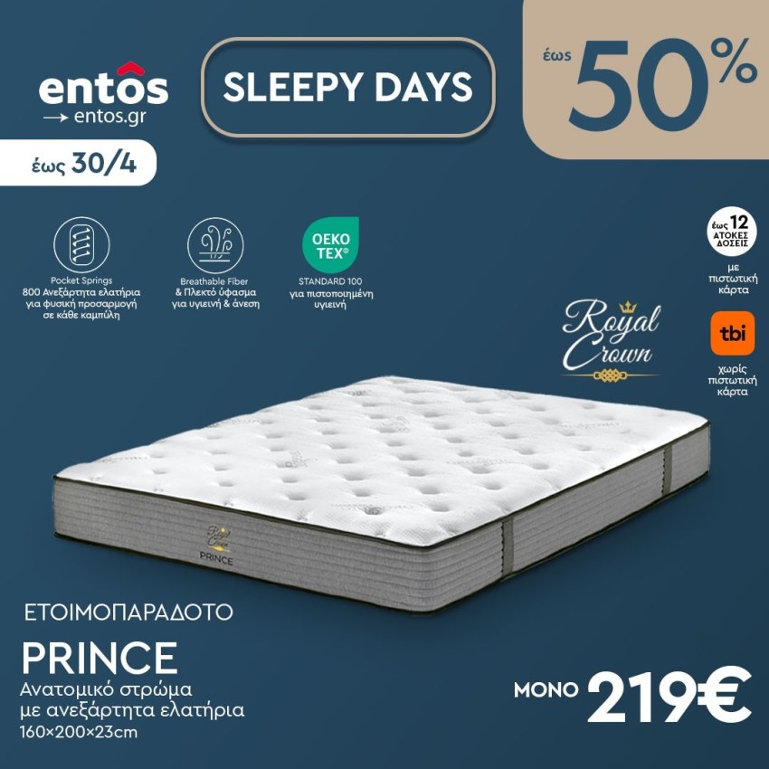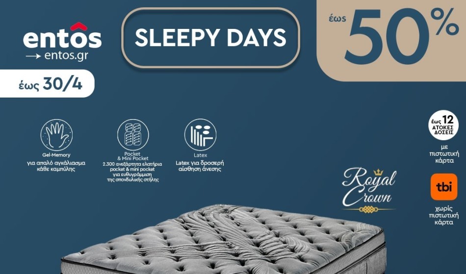 Οι «Sleepy Days» φέρνουν στο κατάστημα Entos στη Χίο την απόλυτη αναβάθμιση στην ποιότητα του ύπνου, με εκπτώσεις που αγγίζουν το -50%. Ανακαλύψτε παρακάτω τα κορυφαία ανατομικά στρώματα των οίκων ROYAL CROWN, SERTA και KING KOIL, που συνδυάζουν τεχνολογία αιχμής και καινοτόμα υλικά για να προσφέρουν την άνεση και την υγιεινή που σας αξίζει.