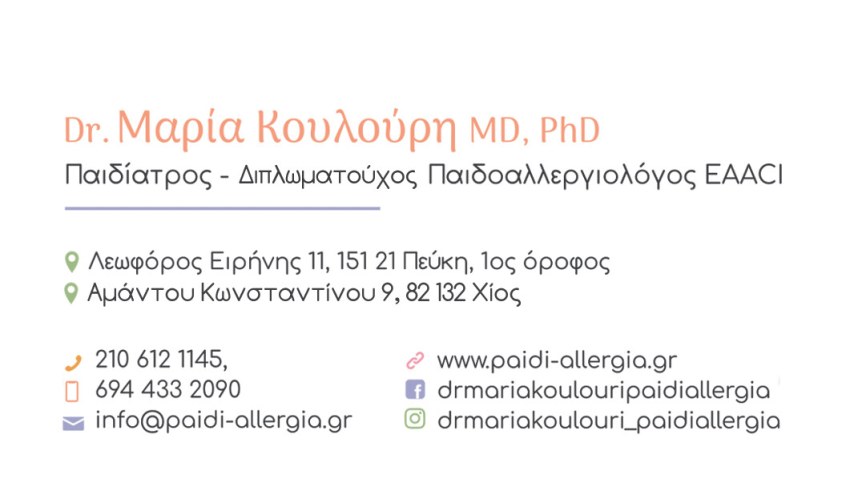 Η Παιδίατρος - Διπλωματούχος Παιδοαλλεργιολόγος EAACI Μαρία Κουλούρη θα δεχθεί στο ιατρείο της Χίου στην οδό Αμάντου Κωνσταντίνου 9 την Τρίτη 23 Δεκεμβρίου και το Σάββατο 3 Ιανουαρίου 2026.