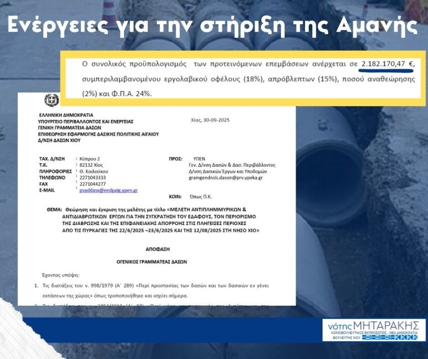 Η Κυβέρνηση ολοκλήρωσε με ταχύτητα τη μελέτη των αντιπλημμυρικών και αντιδιαβρωτικών έργων που θα υλοποιηθούν στις περιοχές της Χίου που επλήγησαν από τις μεγάλες πυρκαγιές του Ιουνίου και του Αυγούστου 2025. Στόχος των παρεμβάσεων είναι η συγκράτηση του εδάφους, ο περιορισμός της διάβρωσης και η αποτροπή έντονων φαινομένων επιφανειακής απορροής που απειλούν τους οικισμούς και τις καλλιέργειες της περιοχής.