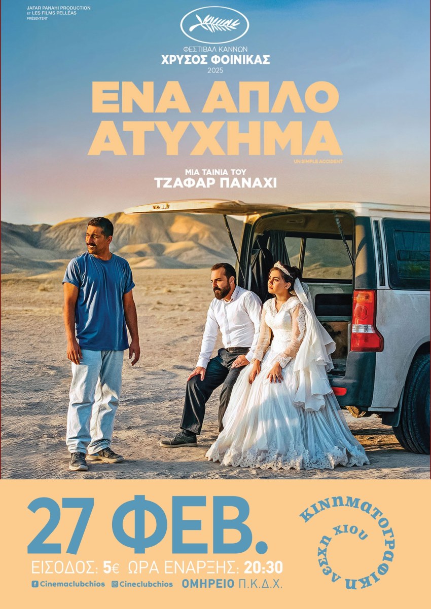 Την Παρασκευή 27 Φεβρουαρίου 2026, στις 20:30, στο Ομήρειο Πνευματικό Κέντρο Δήμου Χίου, θα προβληθεί η νέα ταινία του καταξιωμένου Ιρανού δημιουργού Τζαφάρ Παναχί, με τίτλο «Ένα απλό ατύχημα».