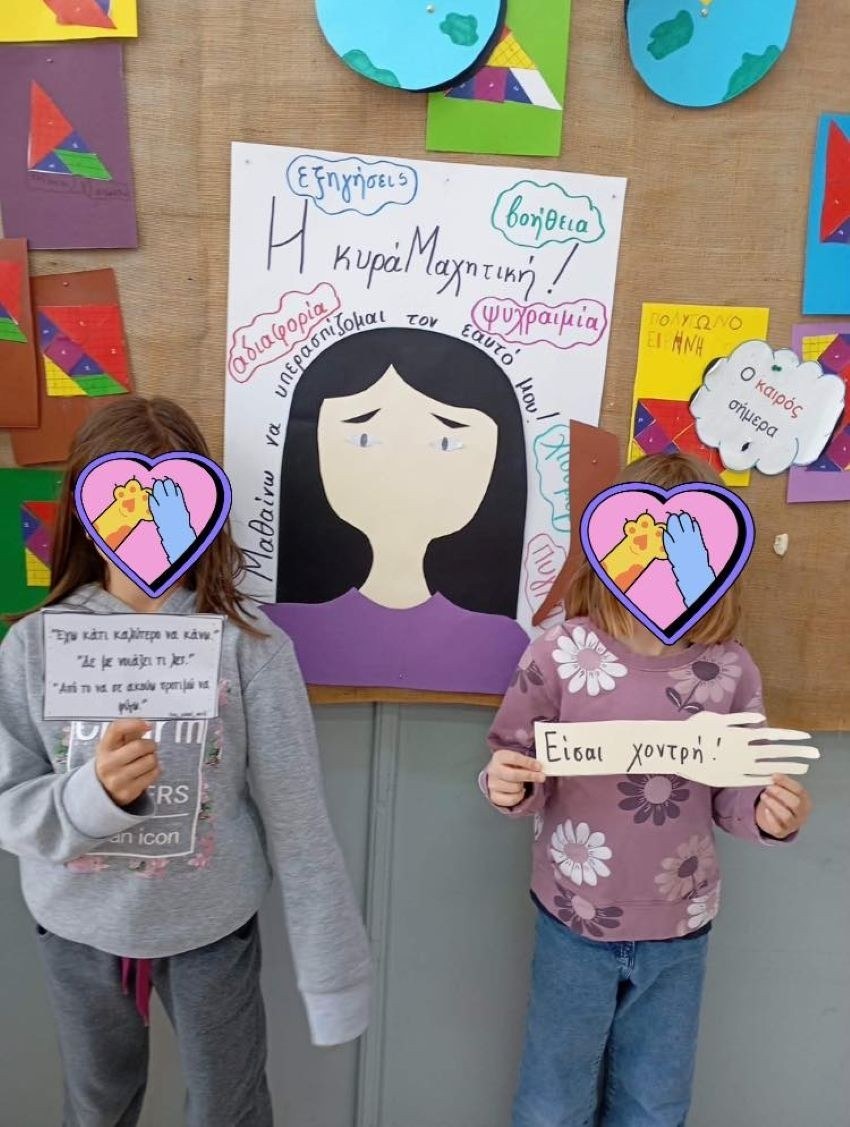 Η κυρά Μαχητική ήρθε στην τάξη μας για να μας προβληματίσει και να μας κινητοποιήσει. Το στόμα της είναι κλειστό από χέρια που φέρουν “κοφτερά λόγια” και ενοχλητικές καταστάσεις. Τα παιδιά ανά ζευγάρια δραματοποίησαν τα παραδείγματα του σχολικού εκφοβισμού και στη συνέχεια κλήθηκαν να επιλέξουν την αντιμετώπιση που θα υιοθετήσουν. Στην ολομέλεια της τάξης σχολιάσαμε τους διαφορετικούς τρόπους αντιμετώπισης και αναδείξαμε τη σημασία της οριοθέτησής μας απέναντι σε λόγια ή καταστάσεις που μας πληγώνουν. Η δράση ολοκληρώθηκε με την ανάγνωση του παραμυθιού ” Η μέρα που έγινα κι εγώ “λύκος ” που περιγράφει με γλαφυρό τρόπο πως μπορεί κάποιος να περάσει από τη θέση του θύματος στη θέση του θύτη.