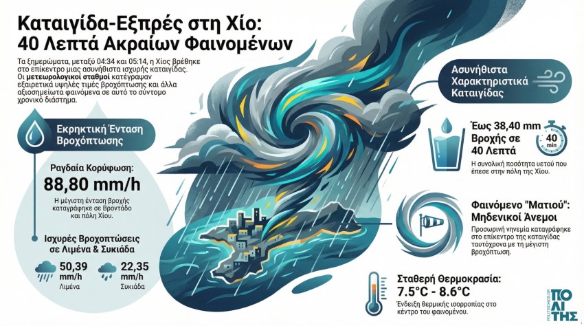 Ασυνήθιστα δεδομένα για το νησί καταγράφηκαν τα ξημερώματα, όταν το νησί πέρασε κυριολεκτικά από το «μάτι» της καταιγίδας. Από τις 04:34 έως τις 05:14, οι μετεωρολογικοί σταθμοί Βροντάδου, πόλης Χίου, λιμένα Χίου και Συκιάδας, κατέγραψαν ιδιαίτερα υψηλές τιμές στην ένταση της βροχόπτωσης (precip rate) αλλά και στη συνολική ποσότητα υετού (precip accumulation), αποτυπώνοντας το μέγεθος και τη δυναμική του καιρικού φαινομένου, για το οποίο είχαν ενημερώσει οι μετεωρολόγοι.