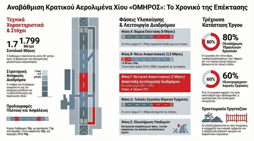 Ιδιαίτερο ενδιαφέρον παρουσιάζει ο χρονικός στόχος που έχει τεθεί από το Υπουργείο, σύμφωνα με τον οποίο η Φάση Γ, δηλαδή το στάδιο κατά το οποίο ο διάδρομος δεν θα είναι διαθέσιμος προς χρήση, επιδιώκεται να βρίσκεται σε εξέλιξη μέσα στο πρώτο τρίμηνο του 2027. Πρόκειται για χρονικό ορόσημο με ιδιαίτερη βαρύτητα, καθώς συνδέεται άμεσα με τον επιχειρησιακό προγραμματισμό του αεροδρομίου, αλλά και με την ευρύτερη συζήτηση για τη μελλοντική αναβάθμιση των αεροπορικών υποδομών της Χίου.
