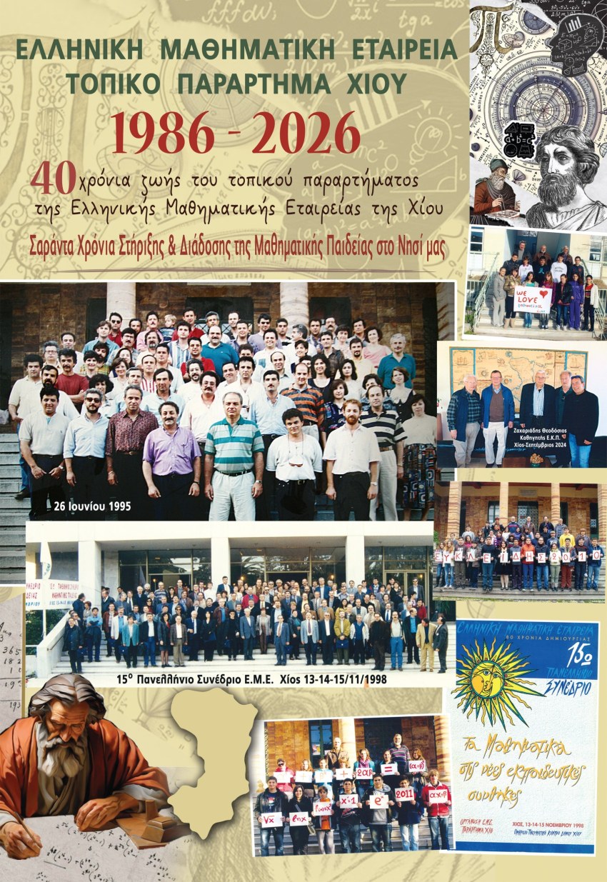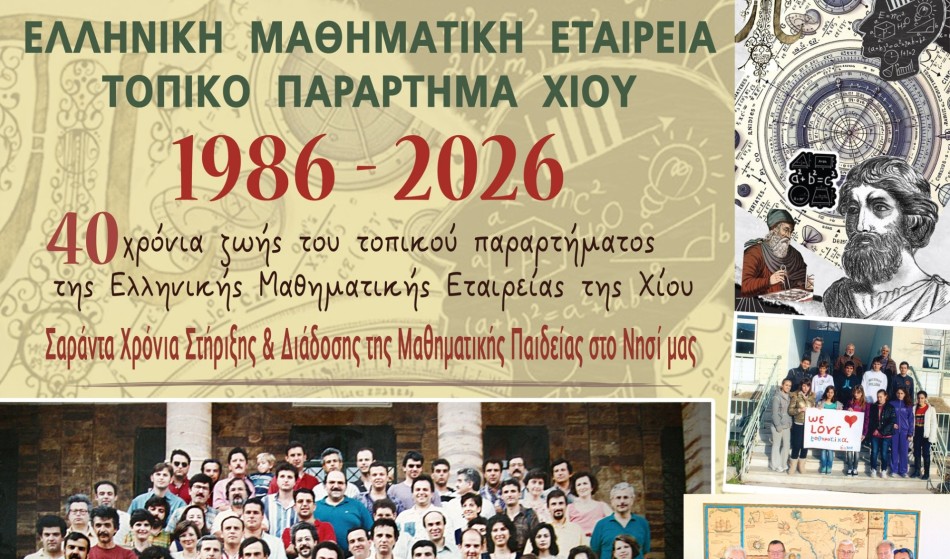 40 χρόνια συνεχούς παρουσίας και προσφοράς συμπληρώνει το Τοπικό Παράρτημα Ν. Χίου της Ελληνικής Μαθηματικής Εταιρείας, το οποίο, με αφορμή την επέτειο αυτή, παρουσιάζει την ειδική επετειακή αφίσα για την περίοδο 1986–2026.