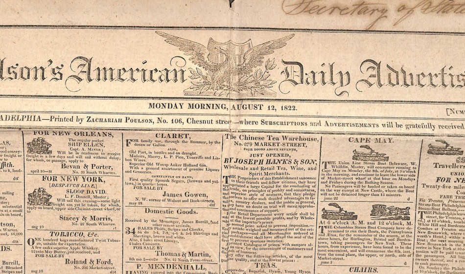 Με ένα ακόμη ανεκτίμητο τεκμήριο της παγκόσμιας δημοσιογραφίας του 19ου αιώνα, εμπλουτίστηκε η συλλογή της Δημόσιας Κεντρικής Ιστορικής Βιβλιοθήκης Χίου «Κοραής». Πρόκειται για φύλλο της αμερικανικής εφημερίδας Poulson’s American Daily Advertiser, που εκδιδόταν στη Φιλαδέλφεια των Ηνωμένων Πολιτειών, με ημερομηνία 12 Αυγούστου 1822.