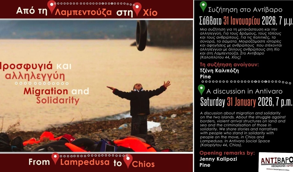 Tο Σάββατο 31 Ιανουαρίου, στις 7 το απόγευμα, το «Αντίβαρο» μας καλεί σε μια συζήτηση για τη μετανάστευση και την αλληλεγγύη. Για τους δρόμους, τους τόπους και τους ανθρώπους. Για τις πολιτικές, τα σύνορα, τα σώματα. Για να μοιραστούμε ιστορίες και αφηγήσεις με ανθρώπους που στέκονται αλληλέγγυοι με άλλους ανθρώπους στη Χίο και στη Λαμπεντούζα.
