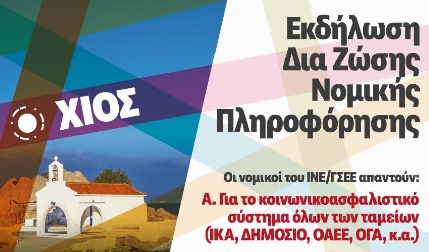 Το Ινστιτούτο Εργασίας της Γ.Σ.Ε.Ε. Βορείου Αιγαίου και το Εργατικό Κέντρο Χίου, σε μια προσπάθεια ανταπόκρισης στην ανάγκη Πληροφόρησης και Συμβουλευτικής Εργαζομένων και Ανέργων, η οποία εντείνεται σε μεγάλο βαθμό από τις πρόσφατες νομοθετικές εξελίξεις, διοργανώνουν στο Εργατικό Κέντρο Χίου την παρακάτω δράση: