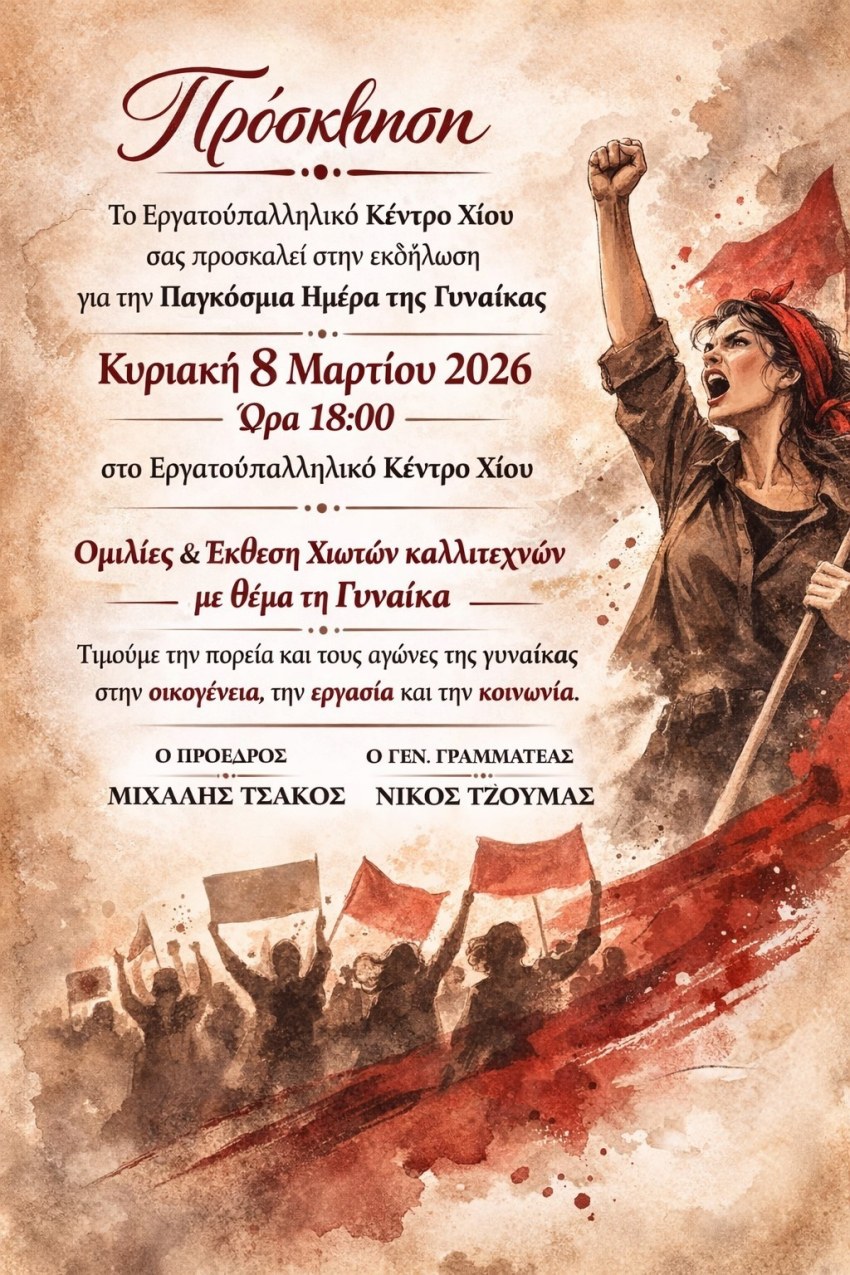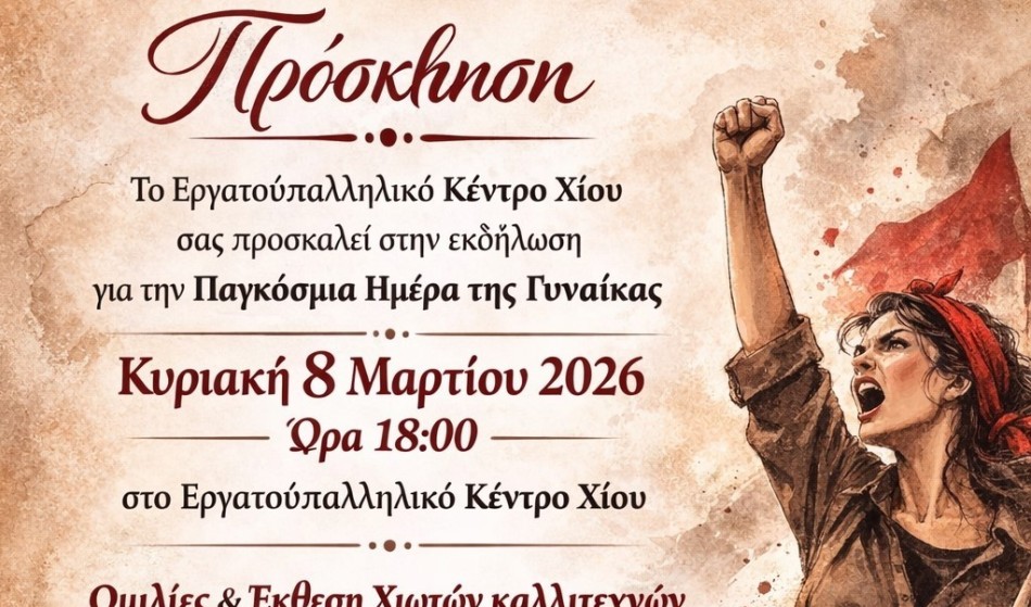 Εκδήλωση με αφορμή την Παγκόσμια Ημέρα της Γυναίκας, την Κυριακή 8 Μαρτίου 2026 και ώρα 18:00, στην αίθουσα εκδηλώσεών του, διοργανώνει το Εργατικό Κέντρο Χίου, τιμώντας την πορεία και τους αγώνες της γυναίκας στην οικογένεια, στην εργασία και στην κοινωνία.