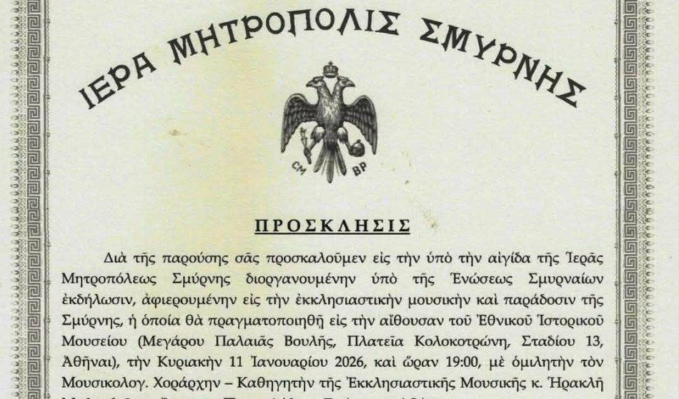 Εκδήλωση αφιερωμένη στην εκκλησιαστική μουσική και παράδοση της Σμύρνης, πραγματοποιεί η Ιερά Μητρόπολη Σμύρνης, στην αίθουσα του Εθνικού Ιστορικού Μουσείου (Μέγαρο Παλιάς Βουλής, Πλατεία Κολοκοτρώνη, Σταδίου 13), την Κυριακή 11 Ιανουαρίου 2026, στις 19:00 με ομιλητή τον Χιώτη Χοράρχη – Καθηγητή της Εκκλησιαστικής Μουσική Ηρακλή Μαλανδρίνο, Άρχοντα Πρωτοψάλτη της Σμύρνης.