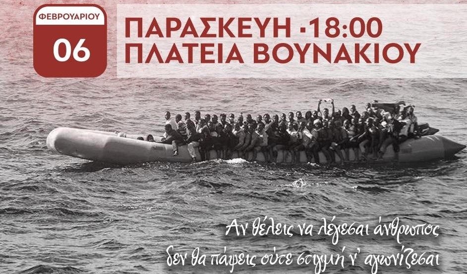 Το Σωματείο απευθύνει κάλεσμα για μαζική συμμετοχή στην κινητοποίηση που θα πραγματοποιηθεί την Παρασκευή 6 Φλεβάρη 2026, στις 18:00, στην Πλατεία Βουνακίου, στέλνοντας μήνυμα ενάντια στον πόλεμο, τον ξεριζωμό και τις πολιτικές που γεννούν θάνατο.