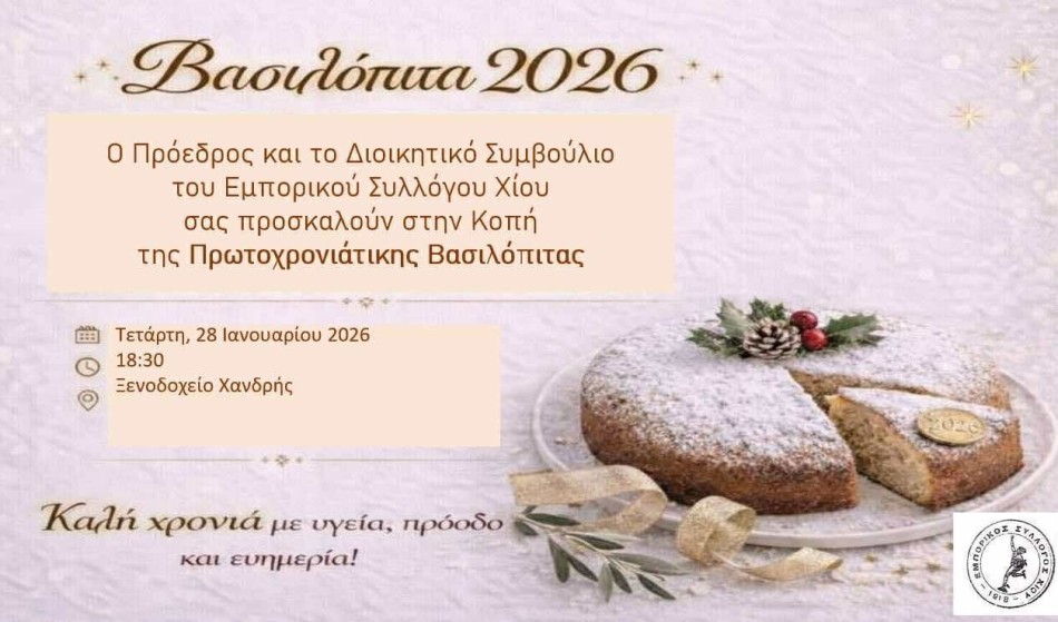Στην καθιερωμένη ετήσια εκδήλωση κοπής της Πρωτοχρονιάτικης πίτας του προσκαλεί τα μέλη και τους φίλους του ο Εμπορικός Σύλλογος Χίου, μέσα από πρόσκληση που υπογράφει ο Πρόεδρος του Διοικητικού Συμβουλίου.