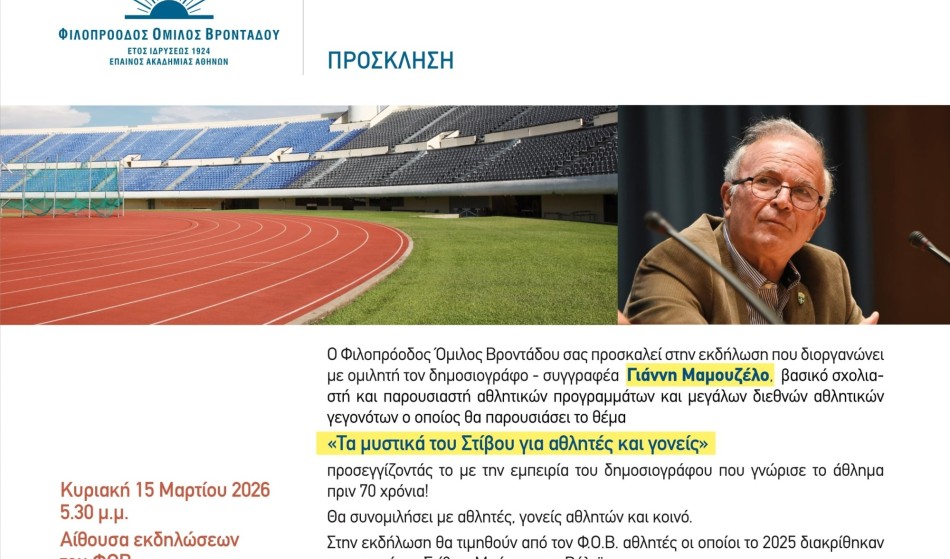 Την ευκαιρία να ακούσουν από κοντά έναν από τους πλέον έμπειρους δημοσιογράφους του ελληνικού αθλητισμού θα έχουν αθλητές, γονείς και φίλοι του στίβου στον Βροντάδο, καθώς ο Γιάννης Μαμουζέλος θα είναι ο κεντρικός ομιλητής σε εκδήλωση που διοργανώνει ο Φιλοπρόοδος Όμιλος Βροντάδου.