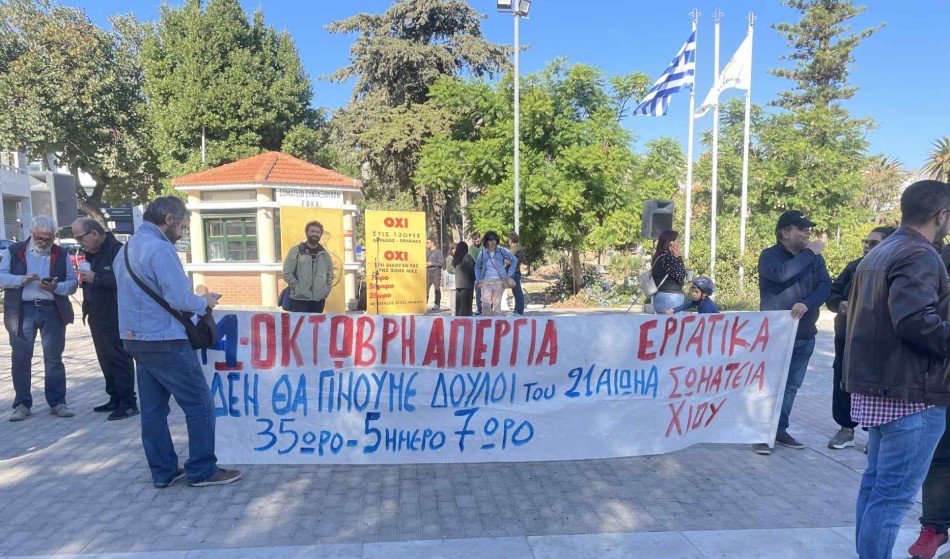 Με κεντρικό σύνθημα «Να μην περάσει το τερατούργημα του 13ώρου!», εργαζόμενοι από τον δημόσιο και ιδιωτικό τομέα της Χίου συμμετείχαν σήμερα στην πανελλαδική 24ωρη απεργία που κήρυξε η Ομοσπονδία Ιδιωτικών Υπαλλήλων Ελλάδας, ανταποκρινόμενοι στο κάλεσμα του Εργατικού Κέντρου και του Νομαρχιακού Τμήματος της ΑΔΕΔΥ.