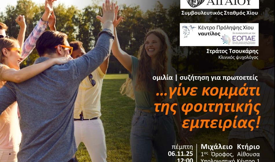 Το Κέντρο Πρόληψης Χίου, σε συνεργασία με τον Εθνικό Οργανισμό Πρόληψης και Αντιμετώπισης Εξαρτήσεων (Ε.Ο.Π.Α.Ε.), διοργανώνει σε συνεργασία με τον Συμβουλευτικό Σταθμό του Πανεπιστημίου Αιγαίου και τον υπεύθυνό του, κ. Αλέξιο-Πατάπιο Κόντη, μία ομιλία-συζήτηση για πρωτοετείς φοιτητές και φοιτήτριες του Πανεπιστημίου, με τίτλο:
