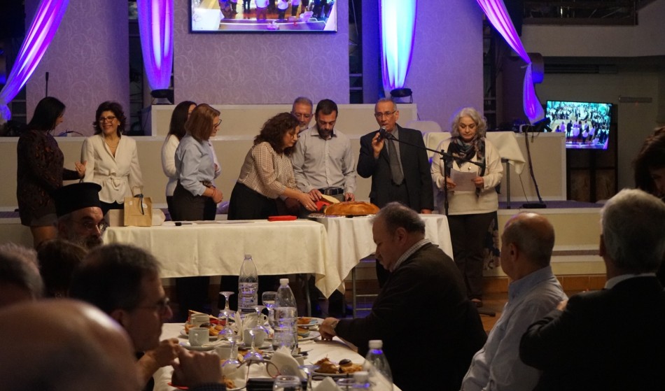 Ο πατέρας Γεώργιος Χανδρής ευλόγησε την Αγιοβασιλόπιτα και μετέφερε τις ευχές του Σεβασμιωτάτου για μια καλή χρονιά με δημιουργικές πολιτιστικές και μορφωτικές δράσεις.