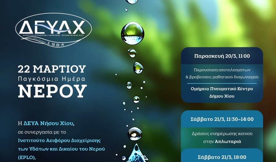 Φέτος για 2 η χρονιά, η ΔΕΥΑ Χίου σε συνεργασία με το Ινστιτούτο Αειφόρου Διαχείρισης των Υδάτων και Δικαίου του Νερού του Ευρωπαϊκού Οργανισμού Δημοσίου Δικαίου (EPLO) στα πλαίσια του προγράμματος με τίτλο: “ΔΡΑΣΕΙΣ ΕΥΑΙΣΘΗΤΟΠΟΙΗΣΗΣ ΚΑΙ ΕΚΠΑΙΔΕΥΣΗΣ ΤΟΥ ΠΛΗΘΥΣΜΟΥ ΤΗΣ ΧΙΟΥ ΓΙΑ ΤΟ ΠΡΟΒΛΗΜΑ ΤΗΣ ΥΔΡΕΥΣΗΣ ΚΑΙ ΤΗΣ ΛΕΙΨΥΔΡΙΑΣ ΣΤΗ ΝΗΣΟ ΧΙΟ ΚΑΙ ΣΤΡΑΤΗΓΙΚΕΣ ΑΝΤΙΜΕΤΩΠΙΣΗΣ ΤΟΥ ΠΡΟΒΛΗΜΑΤΟΣ” οργανώνει τριήμερο εορταστικών εκδηλώσεων για να τιμήσει την παγκόσμια ημέρα νερού 2026.