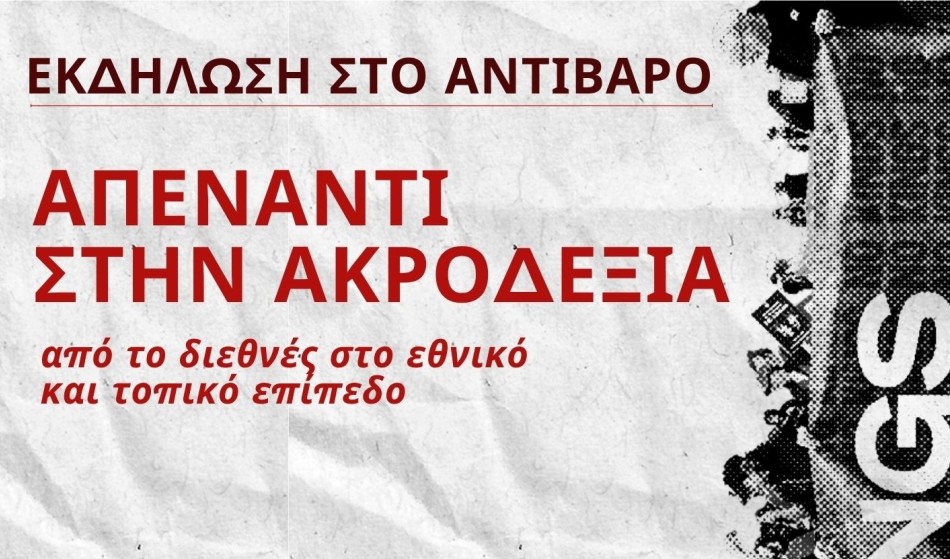 Στην επιτακτική ανάγκη κατανόησης των σύγχρονων μορφών της ακροδεξιάς και των μηχανισμών διάχυσής της σε διεθνές, εθνικό και τοπικό επίπεδο, επικεντρώνεται η εκδήλωση που διοργανώνει ο Κοινωνικός Χώρος Αντίβαρο, το Σάββατο 22 Νοεμβρίου, στις 7.30 μ.μ., στον χώρο του στην οδό Καλοπλύτου 44.