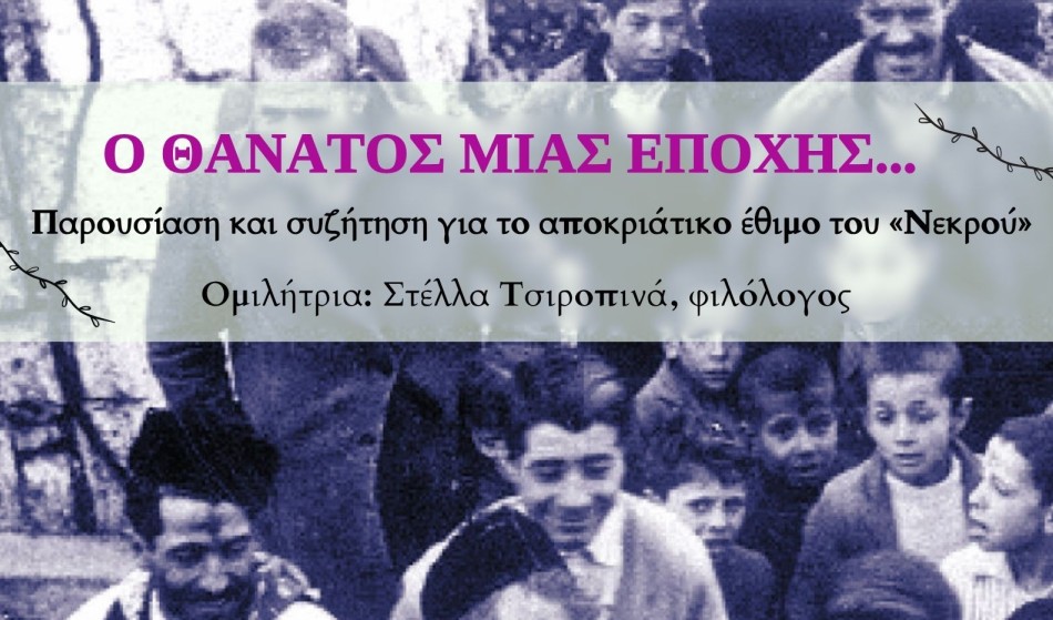 Το Σάββατο, 21 Φλεβάρη, στις 7 το βράδυ, στο «Αντίβαρο» (Καλοπλύτου 44) το εθιμικό αποκριάτικο παρελθόν των αγροτικών κοινοτήτων του νησιού θα συναντηθεί με το παρόν μας, σε μια παρουσίαση-συζήτηση για το έθιμο του «Νεκρού».