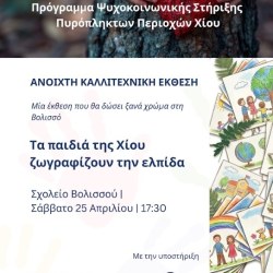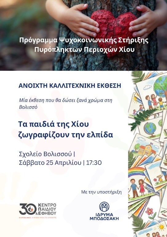 Μια ξεχωριστή καλλιτεχνική έκθεση φιλοξενείται το επόμενο Σάββατο 25 Απριλίου στις 17:30 στο σχολείο της Βολισσού. Τα παιδιά των πυρόπληκτων περιοχών της Χίου παίρνουν τα πινέλα τους και μετατρέπουν τις δύσκολες εμπειρίες που βίωσαν σε μηνύματα αισιοδοξίας, χρώματος και ζωής.