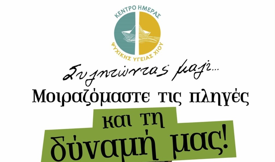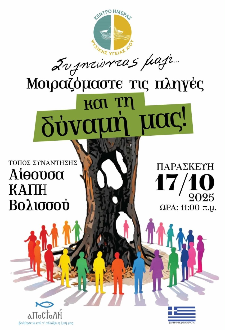 Με αφορμή την Παγκόσμια Ημέρα Ψυχικής Υγείας, η ομάδα του Κέντρου Ημέρας Ψυχικής Υγείας Χίου πραγματοποιεί την Παρασκευή 17 Οκτωβρίου 2025, στις 11:00 το πρωί, βιωματική συνάντηση στη Βολισσό, στην αίθουσα του ΚΑΠΗ.