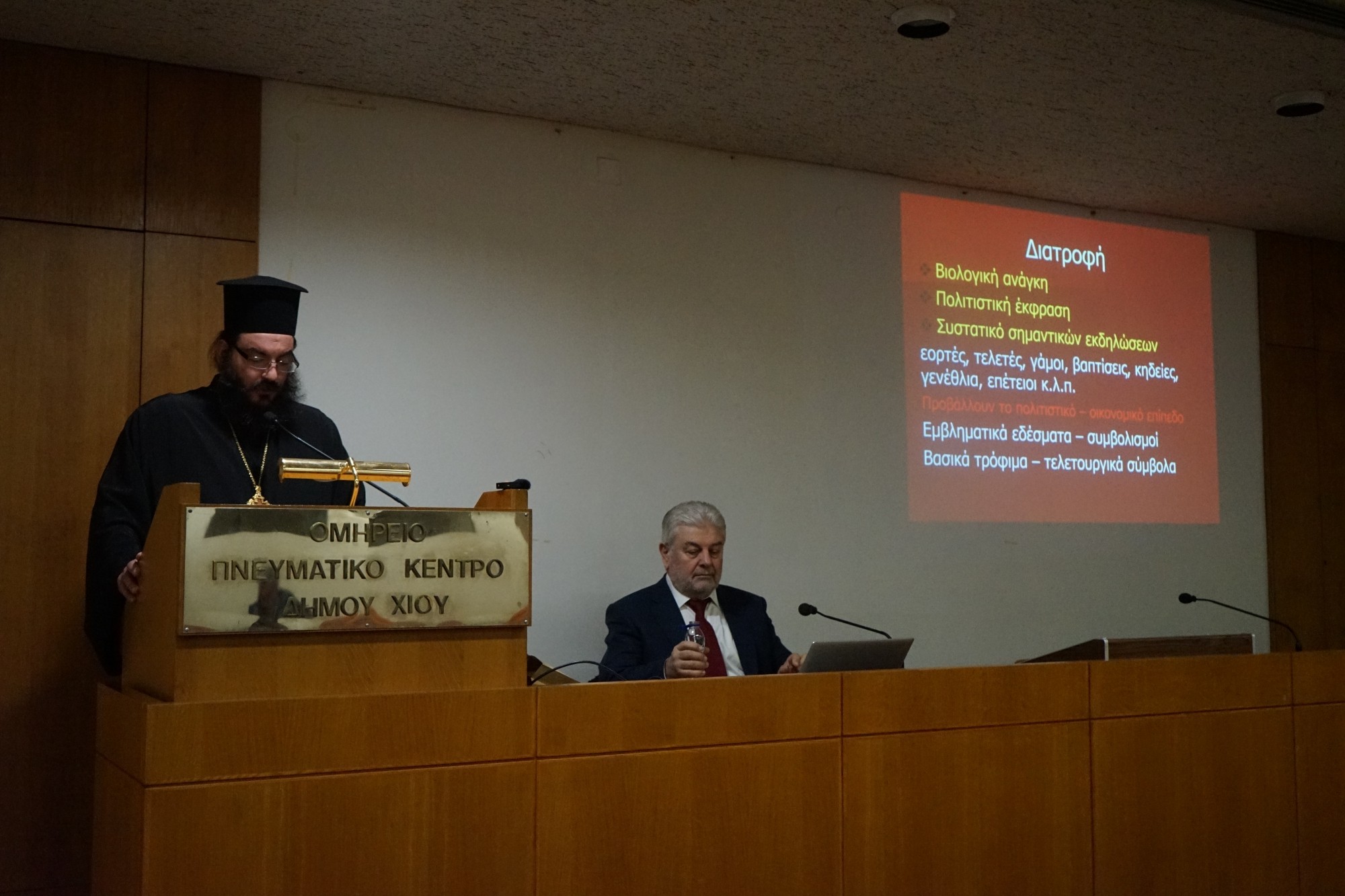 Στον σύντομο χαιρετισμό του Σεβασμιωτάτου Μητροπολίτη Χίου κ.κ. Μάρκου, ο οποίος αναγνώστηκε από εκπρόσωπό του, επισημάνθηκε πως «ο Μέγας Βασίλειος δεν έμεινε στη θεωρία της αγάπης, αλλά την εφάρμοσε με πράξεις, όχι μόνο με τη βασιλόπιτα αλλά και με τη 'Βασιλειάδα', το μεγάλο φιλανθρωπικό ίδρυμα για φτωχούς και ασθενείς».