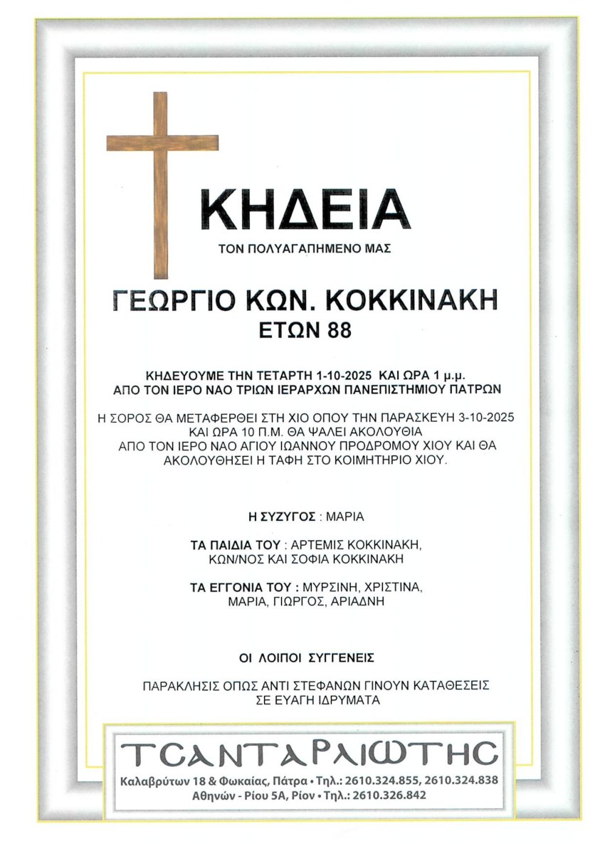 Η σορός θα μεταφερθεί στη Χίο όπου την Παρασκευή 3-10-2025 και ώρα 10 π.μ. θα ψαλεί ακολουθία από τον ιερό ναό Αγίου Ιωάννου Προδρόμου Χίου και θα ακολουθήσει η ταφή στο κοιμητήριο Χίου.