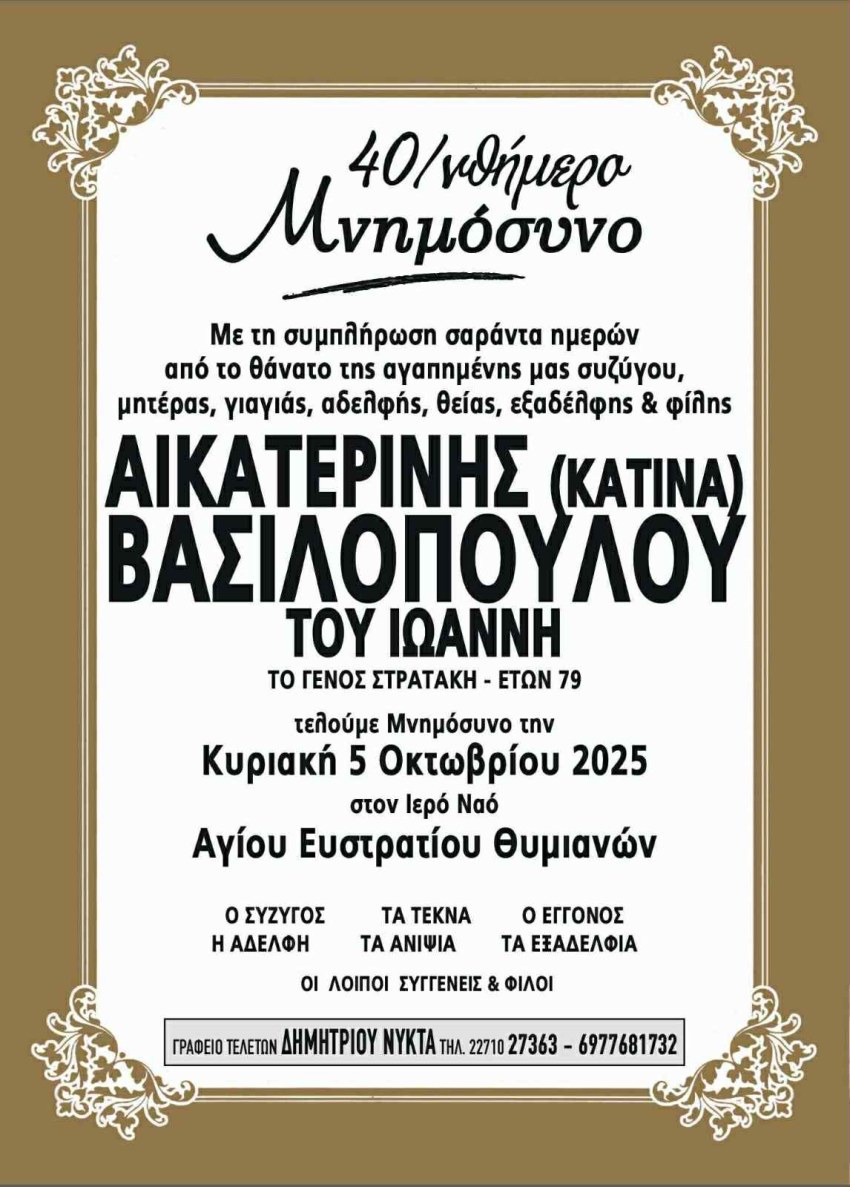 Με τη συμπλήρωση σαράντα ημερών από το θάνατο της αγαπημένης μας συζύγου, μητέρας, γιαγιάς, αδελφής, θείας, εξαδέλφης και φίλης