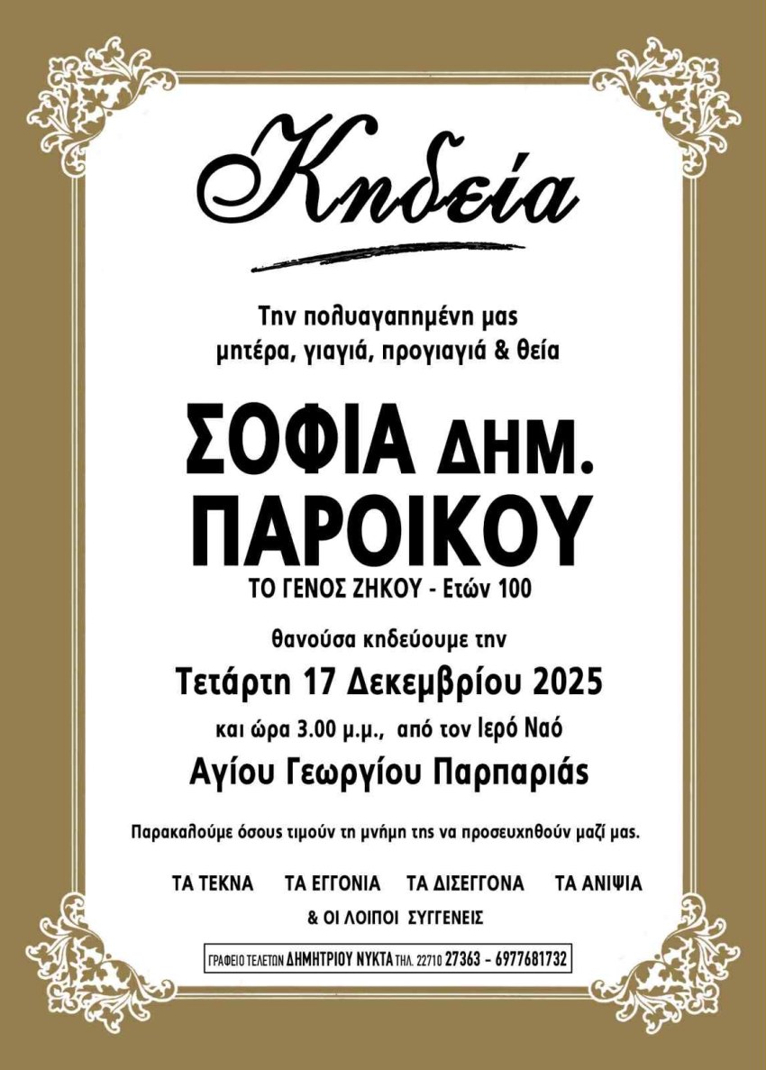 θανούσα κηδεύουμε την Τετάρτη 17 Δεκεμβρίου 2025, Ιερό Ναό Αγίου Γεωργίου Παρπαριάς
