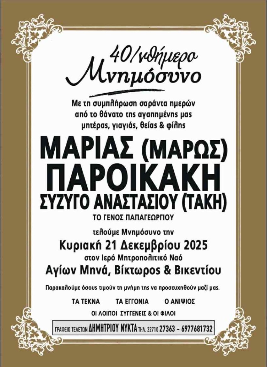 Με τη συμπλήρωση σαράντα ημερών από τον θάνατο της αγαπημένης μας μητέρας, γιαγιάς, θείας και φίλης