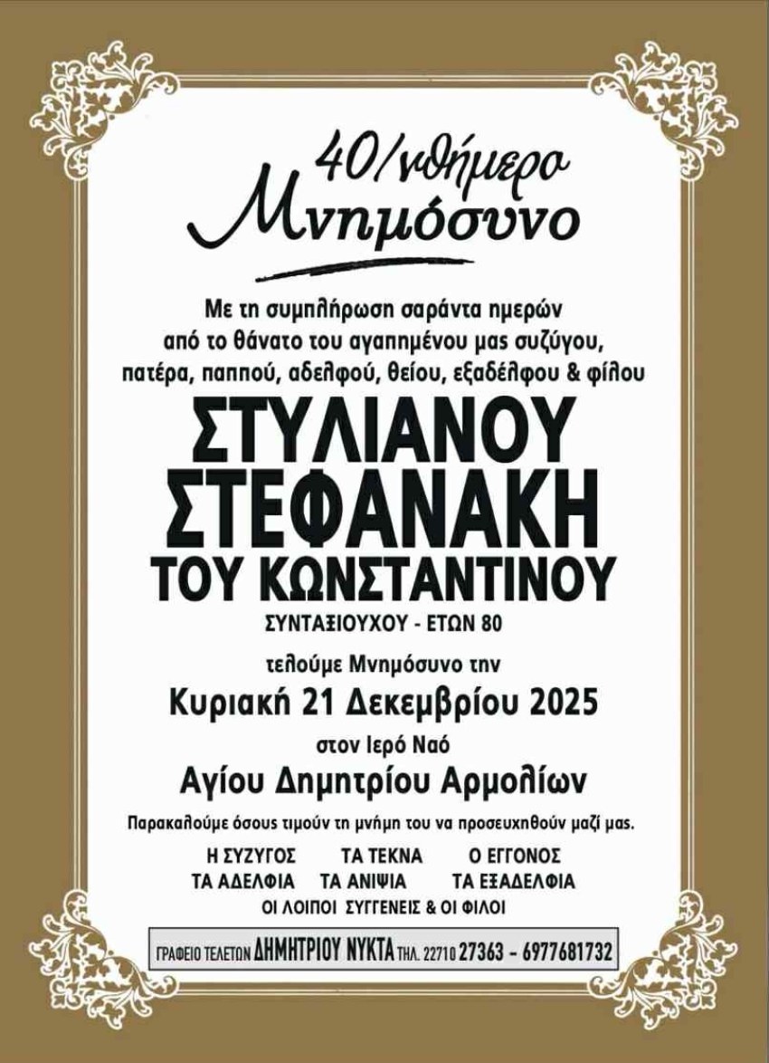 Με τη συμπλήρωση σαράντα ημερών από τον θάνατο του αγαπημένου μας συζύγου, πατέρα, παππού, αδελφού, θείου, εξάδελφου και φίλου