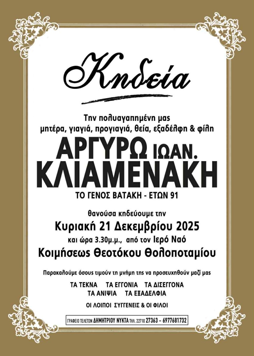 Θανούσα κηδεύουμε την Κυριακή 21 Δεκεμβρίου 2025 και ώρα 3.30 μ.μ. από τον Ιερό Ναό Κοιμήσεως Θεοτόκου Θολοποταμίου