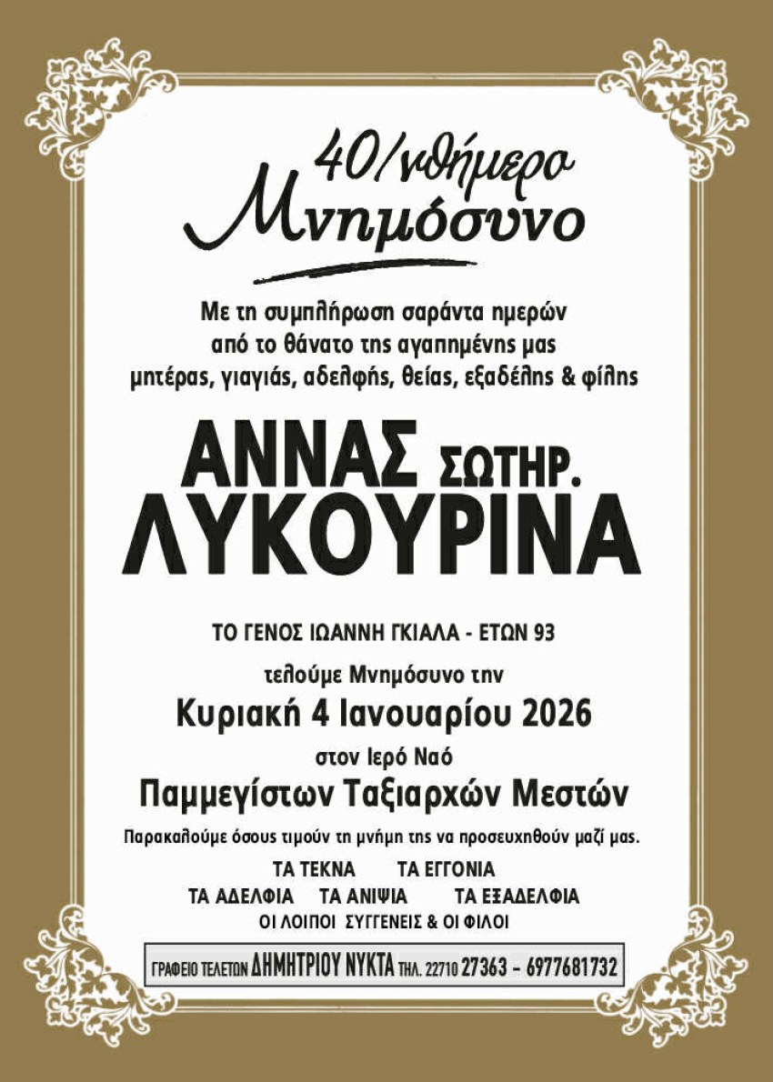Με τη συμπλήρωση σαράντα ημερών από τον θάνατο της αγαπημένης μας μητέρας, γιαγιάς, αδελφής, θείας, εξαδέλφης και φίλης