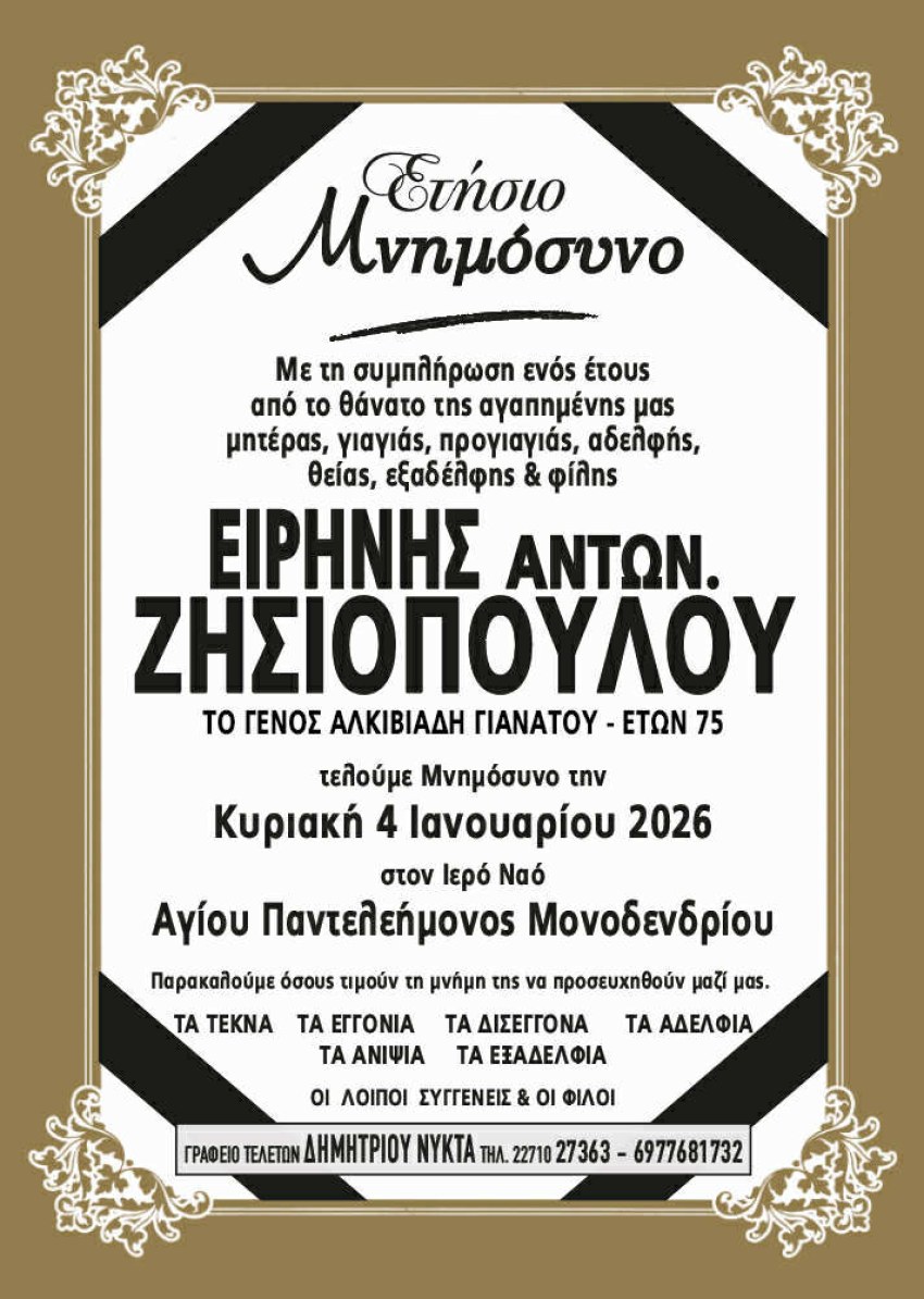 Με τη συμπλήρωση ενός έτους από τον θάνατο της αγαπημένης μας μητέρας, γιαγιάς, προγιαγιάς, αδελφής, θείας, εξαδέλφης και φίλης