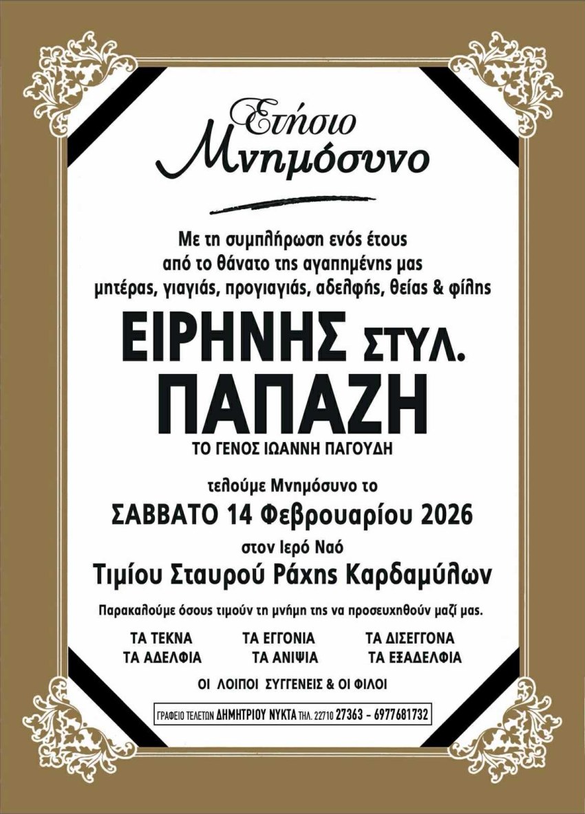 τελούμε Μνημόσυνο το Σάββατο 14 Φεβρουαρίου 2026 στον Ιερό Ναό Τιμίου Σταυρού Ράχης Καρδαμύλων