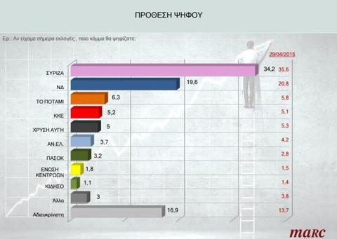 Στην πρόθεση ψήφου ο ΣΥΡΙΖΑ διατηρεί προβάδισμα 14, 7 μονάδων έναντι της ΝΔ, ωστόσο και τα δύο κόμματα σημειώνουν πτώση πάνω από μια μονάδα, ενώ σαφή πτώση παρουσιάζει ο δείκτης θετικής αξιολόγησης της κυβέρνησης και ικανοποίησης από τις διαπραγματεύσεις.
