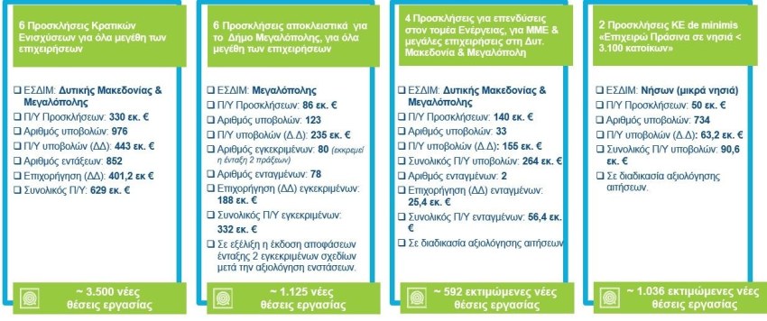 • 6 προσκλήσεις κρατικών ενισχύσεων για όλα τα μεγέθη επιχειρήσεων στη Δυτική Μακεδονία και τη Μεγαλόπολη, προϋπολογισμού 330 εκατ. ευρώ, κινητοποίησαν 976 υποβολές, με 852 πράξεις να προχωρούν σε ένταξη ή να βρίσκονται υπό ένταξη. Η Δημόσια Δαπάνη ανέρχεται σε 401,2 εκατ. ευρώ, με συνολικό προϋπολογισμό έργων 629 εκατ. ευρώ. Οι έξι προσκλήσεις αποκλειστικά για τον Δήμο Μεγαλόπολης (προϋπολογισμός 86 εκατ. ευρώ) κατέγραψαν 123 υποβολές και οδήγησαν σε 80 εγκρίσεις, με Δημόσια Δαπάνη 188 εκατ. ευρώ και συνολικό προϋπολογισμό εγκεκριμένων έργων 332 εκατ. ευρώ.