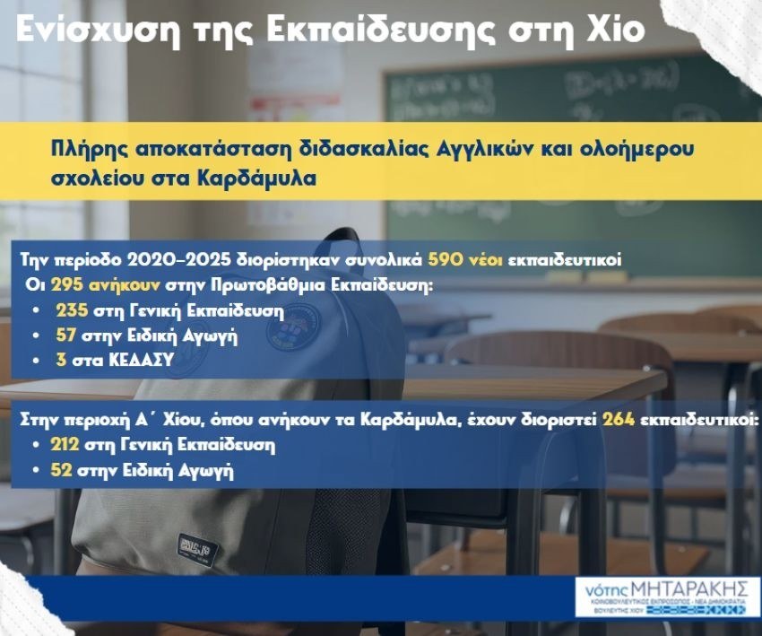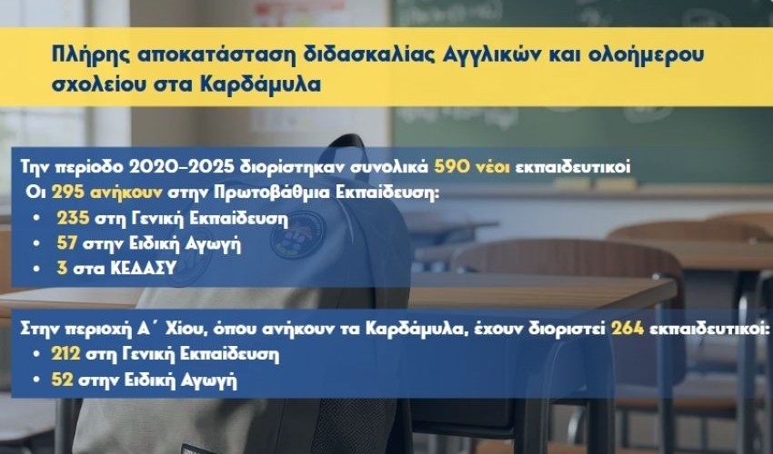 Σύμφωνα με στοιχεία του Υπουργείου Παιδείας και Θρησκευμάτων, την περίοδο 2020-2025 έχουν διοριστεί στη Χίο 590 νέοι εκπαιδευτικοί, εκ των οποίων 295 στην Πρωτοβάθμια Εκπαίδευση, 235 στη Γενική Εκπαίδευση, 57 στην Ειδική Αγωγή και 3 στα ΚΕΔΑΣΥ, ενισχύοντας σημαντικά τη στελέχωση των σχολικών μονάδων και διασφαλίζοντας την ομαλή λειτουργία τους. Πιο συγκεκριμένα, στην περιοχή της Α΄ Χίου, όπου ανήκουν τα Καρδάμυλα, έχουν διοριστεί 264 εκπαιδευτικοί, εκ των οποίων 212 στην Γενική Εκπαίδευση και 52 στην Ειδική Αγωγή. Στα ανωτέρω στοιχεία δε συμπεριλαμβάνονται οι αναπληρωτές που έχουν διοριστεί κατά το έτος 2025.