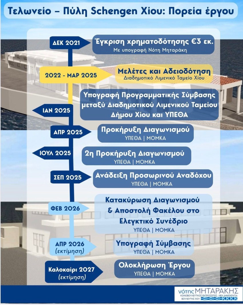 Η αναβάθμιση του Τελωνείου Χίου είναι ένα έργο με σαφές σχέδιο, χρονοδιάγραμμα και συγκεκριμένα βήματα. Με πρωτοβουλία μου, το έργο χρηματοδοτήθηκε τον Δεκέμβριο του 2021 με 3 εκατ. ευρώ από το Υπουργείο Μετανάστευσης και Ασύλου.