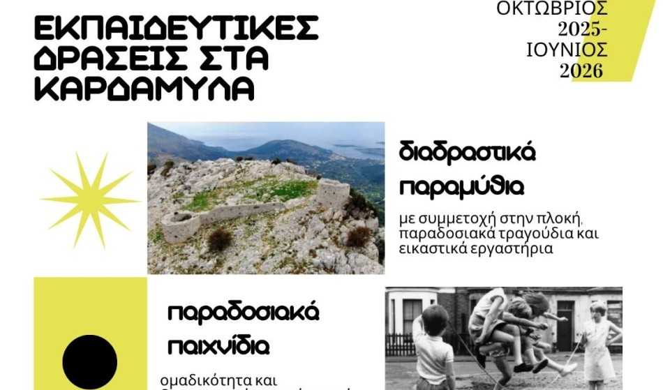 Το Πνευματικό Κέντρο Καρδαμύλων ανακοινώνει την έναρξη μιας σειράς εκπαιδευτικών δράσεων για μαθητές Δημοτικού, Α’ και Β’ Γυμνασίου, που φιλοδοξούν να συνδέσουν τη γνώση με την παράδοση και τον πολιτισμό του τόπου. Οι δράσεις πραγματοποιούνται υπό την αιγίδα του Κέντρου και έχουν σχεδιαστεί για να ενισχύσουν τη βιωματική μάθηση μέσα από παραμύθια, μουσικές, παιχνίδια, τέχνες και δημιουργικά εργαστήρια.