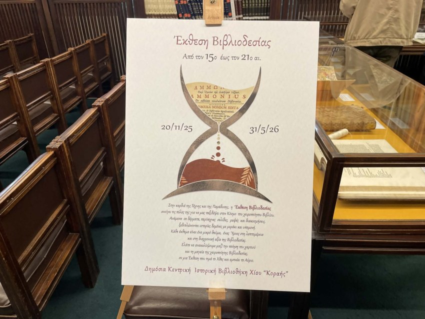 Από σήμερα, 20 Νοεμβρίου 2025, έως και τις 31 Μαΐου 2026, η Δημόσια Κεντρική Ιστορική Βιβλιοθήκη Χίου «Κοραής» ανοίγει τις πόρτες της στο κοινό για να παρουσιάσει μία ξεχωριστή έκθεση βιβλιοδεσίας, που καλύπτει έξι ολόκληρους αιώνες ιστορίας του βιβλίου, από τον 15ο έως τον 21ο αιώνα. Η έκθεση είναι αποτέλεσμα συνεργασίας του Εφορευτικού Συμβουλίου και της Διεύθυνσης της Βιβλιοθήκης με τον βιβλιοδέτη-καλλιτέχνη Κωνσταντίνο Στείρο, ο οποίος υπογράφει μεγάλο μέρος του υλικού και της καλλιτεχνικής επιμέλειας.