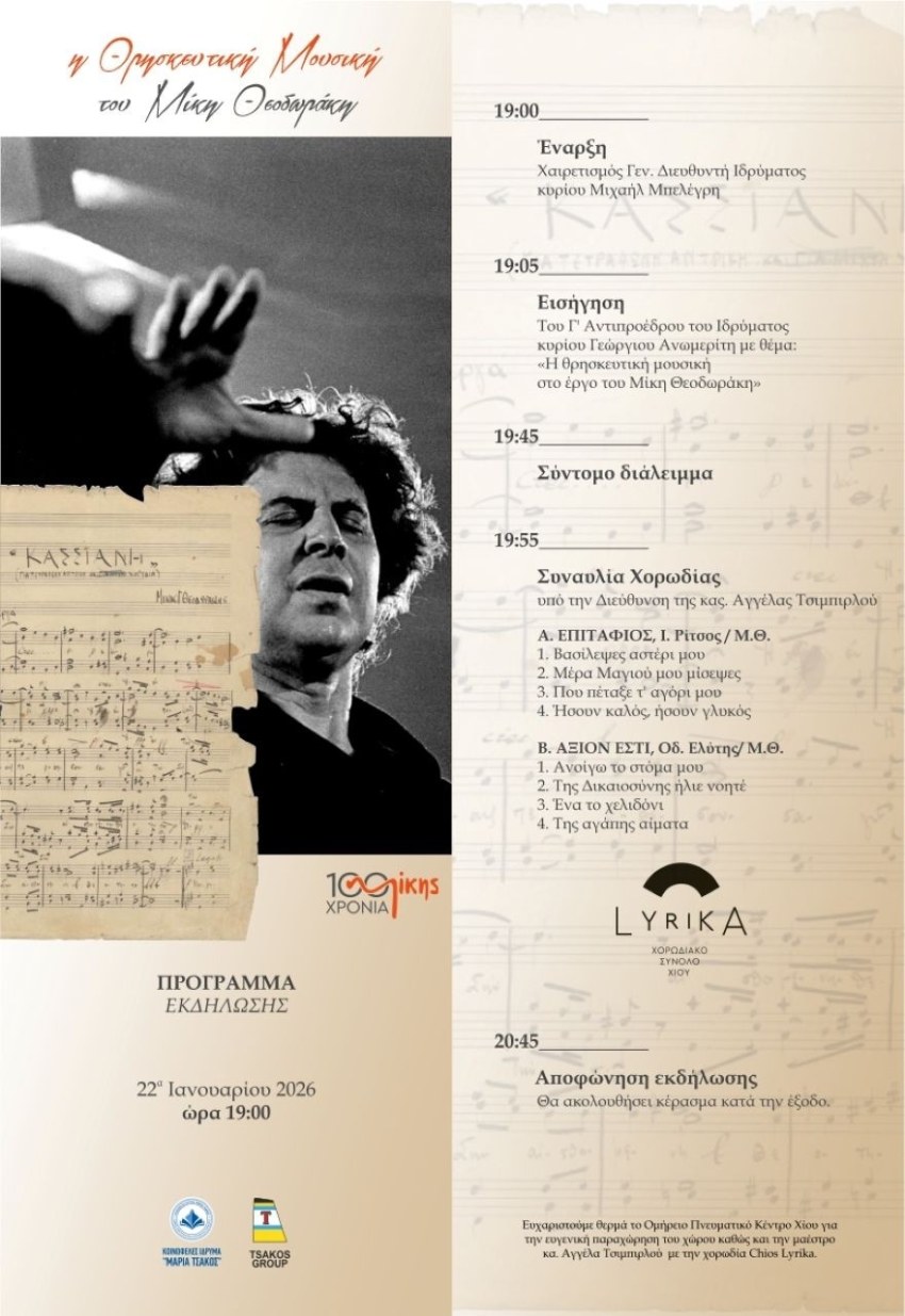 Το Κοινωφελές Ίδρυμα «Μαρία Τσάκος» – Διεθνές Κέντρο Ναυτικής Έρευνας και Παράδοσης διοργανώνει επετειακή μουσική εκδήλωση τιμής και μνήμης για τα 100 χρόνια από τη γέννηση του Μίκη Θεοδωράκη στη Χίο. Η εκδήλωση, με τίτλο «Η θρησκευτική μουσική του Μίκη Θεοδωράκη», θα πραγματοποιηθεί την Πέμπτη 22 Ιανουαρίου 2026, στις 19:00, στο Ομήρειο Πνευματικό Κέντρο Χίου, τιμώντας ένα από τα κορυφαία κεφάλαια του έργου του μεγάλου Έλληνα δημιουργού.
