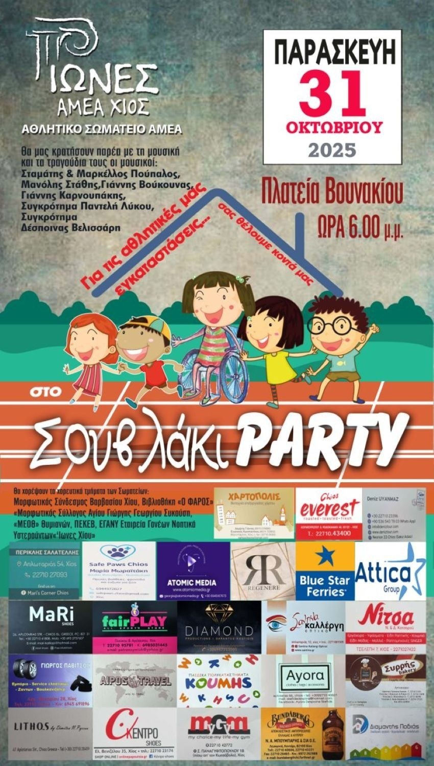 Ένα μοναδικό απόγευμα γεύσης, μουσικής και χορού υπόσχεται για ακόμη μία χρονιά το Νομαρχιακό Αθλητικό Σωματείο ΑμεΑ ΙΩΝΕΣ ΧΙΟΥ, το οποίο διοργανώνει το καθιερωμένο του «Σουβλάκι Party» την Παρασκευή 31 Οκτωβρίου στις 6:00 μ.μ., στην Πλατεία Βουνακίου.