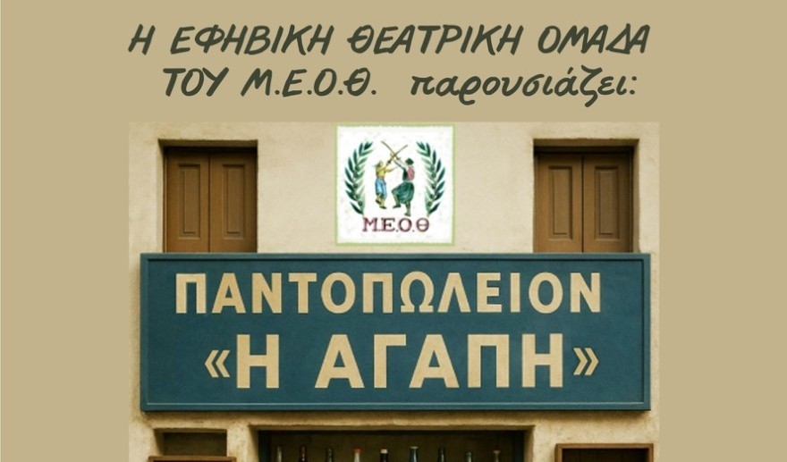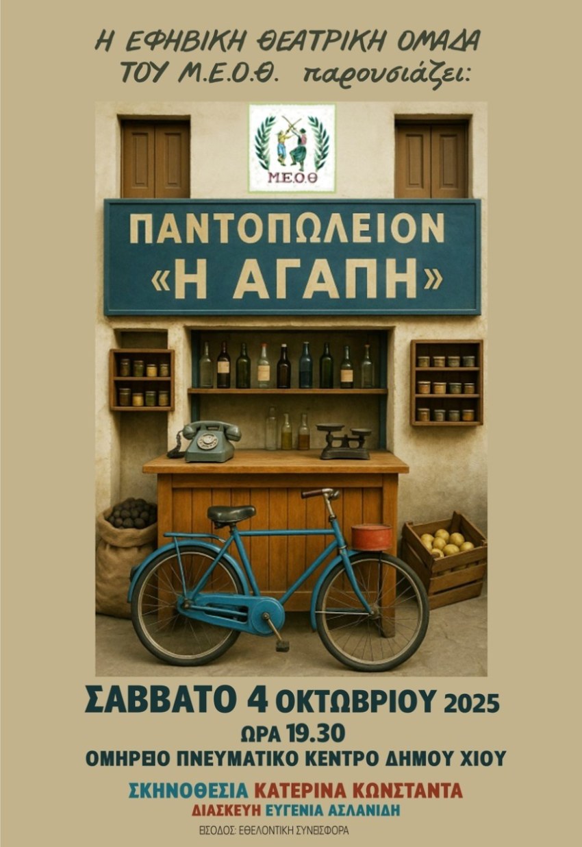Η Εφηβική Θεατρική Ομάδα του Μορφωτικού Εκπολιτιστικού Ομίλου Θυμιανών (Μ.Ε.Ο.Θ.) ανεβάζει τη φετινή της παράσταση στο Ομήρειο Πνευματικό Κέντρο Δήμου Χίου, το Σάββατο 4 Οκτωβρίου στις 19:30. Πρόκειται για την κωμωδία «Παντοπωλείον: Η Αγάπη», μια διασκευή του θρυλικού έργου «Της Κακομοίρας» των Χρήστου και Γιώργου Γιαννακόπουλου, σε διασκευή Ευγενίας Ασλανίδη και σκηνοθεσία Κατερίνας Κωνσταντά, επιμορφώτριας της θεατρικής ομάδας.