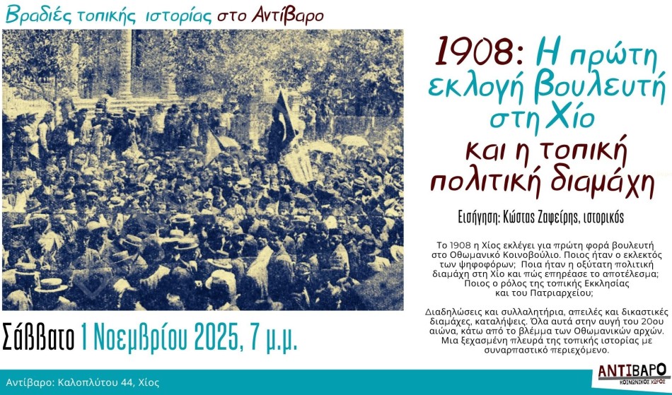Μια από τις πιο άγνωστες αλλά εξαιρετικά ενδιαφέρουσες πτυχές της χιακής ιστορίας ζωντανεύει το Σάββατο 1η Νοεμβρίου, στις 7 το απόγευμα, στον Κοινωνικό Χώρο Αντίβαρο, στο πλαίσιο του κύκλου εκδηλώσεων «Βραδιές Τοπικής Ιστορίας». Η βραδιά είναι αφιερωμένη στην πρώτη εκλογή βουλευτή από τη Χίο στο Οθωμανικό Κοινοβούλιο, το 1908 — τέσσερα μόλις χρόνια πριν την ενσωμάτωση του νησιού στο ελληνικό κράτος.