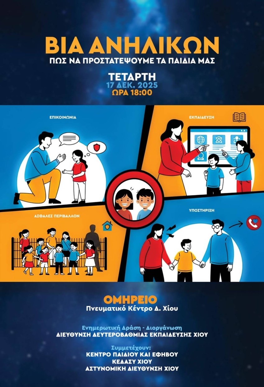 Μία εξαιρετικά επίκαιρη και σημαντική ημερίδα, αφιερωμένη στη βία μεταξύ ανηλίκων, διοργανώνει την Τετάρτη 17 Δεκεμβρίου 2025 και ώρα 18:00 η Διεύθυνση Δευτεροβάθμιας Εκπαίδευσης Χίου, στο Ομήρειο Πνευματικό Κέντρο.