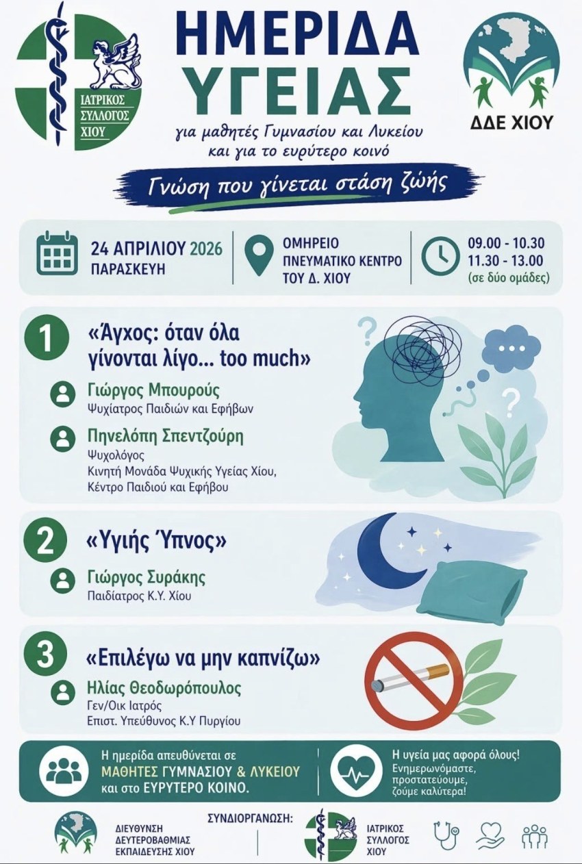 Τρεις στοχευμένες ομιλίες με αντικείμενο το άγχος, τον ύπνο και το κάπνισμα, διοργανώνει την Παρασκευή 24 Απριλίου 2026 ο Ιατρικός Σύλλογος Χίου, απευθυνόμενος σε μαθητές Γυμνασίων και Λυκείων του νησιού, αλλά και στο ευρύτερο κοινό.
