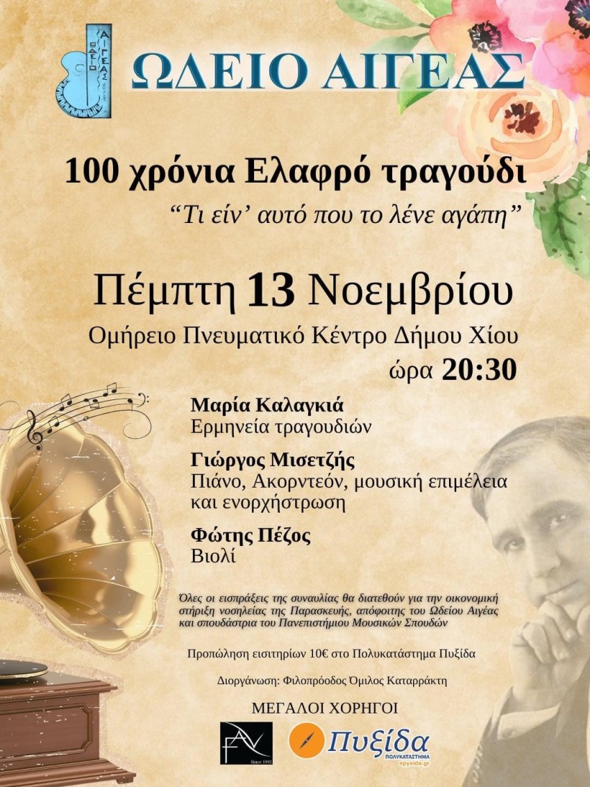 Μια μουσική παράσταση αφιερωμένη στα 100 χρόνια του ελληνικού ελαφρού τραγουδιού παρουσιάζει το Ωδείο Αιγέας, την Πέμπτη 13 Νοεμβρίου 2025, στις 20:30, στο Ομήρειο Πνευματικό Κέντρο Δήμου Χίου. Μέσα από ένα νοσταλγικό μουσικό ταξίδι που εκτείνεται από το 1925 μέχρι και σήμερα, το κοινό θα έχει την ευκαιρία να γνωρίσει και να ανακαλύψει ξανά έναν ολόκληρο αιώνα ελληνικής μουσικής δημιουργίας, με οδηγό τα διαχρονικά χαρακτηριστικά του είδους: τη μελωδικότητα, τον ρομαντισμό και την αισθητική λεπτότητα.