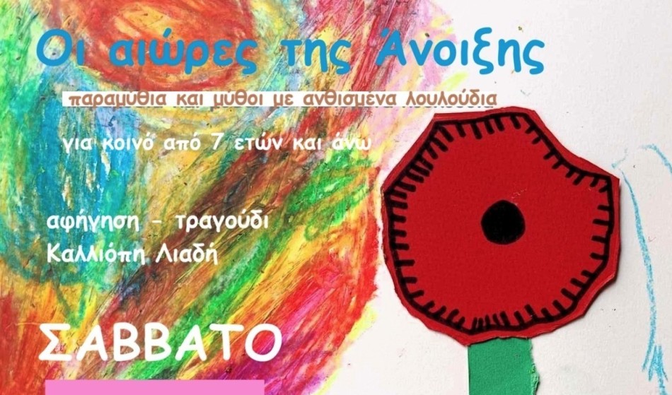 Στην συνάντηση του Σαββάτου θα τραγουδήσουμε όλοι μαζί, θα γνωρίσουμε μια κοπέλα, τη Γαρυφαλιά που φροκάλιζε τη θαλασσα, θα δούμε τι δώρο έκαναν οι Μοίρες σε ένα κορίτσι που στολίστηκε με παπαρούνες, πώς ο πανέμορφος Άδωνις έφερνε την άνοιξη αλλά και πώς εμφανίστηκαν οι πρώτες ανεμώνες.