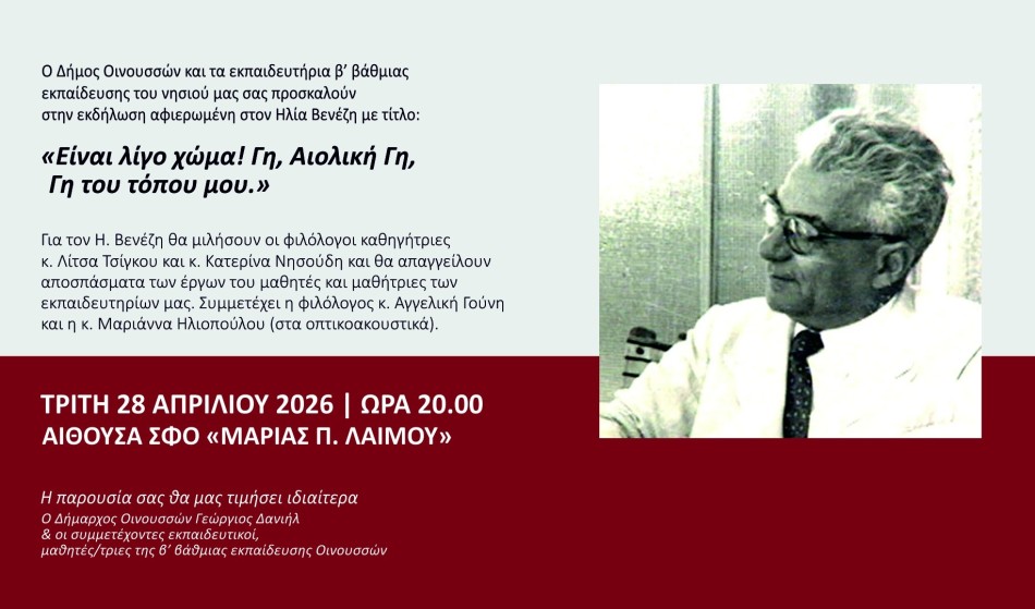 Ο Δήμος Οινουσσών και τα εκπαιδευτήρια β’ βάθμιας εκπαίδευσης του νησιού συνεχίζοντας τα φιλολογικά αφιερώματα στους μεγάλους λογοτέχνες της Μικρασίας τιμούν τον συγγραφέα κι ακαδημαϊκό Ηλία Βενέζη (Αιβαλί 1904-Αθήνα 1973) σε εκδήλωση με τίτλο «Είναι λίγο χώμα! Γη, Αιολική Γη, Γη του τόπου μας» την οποία διοργανώνουν την Τρίτη 28 Απριλίου στις 20.00 στην αίθουσα ΣΦΟ «Μαρίας Π. Λαιμού».