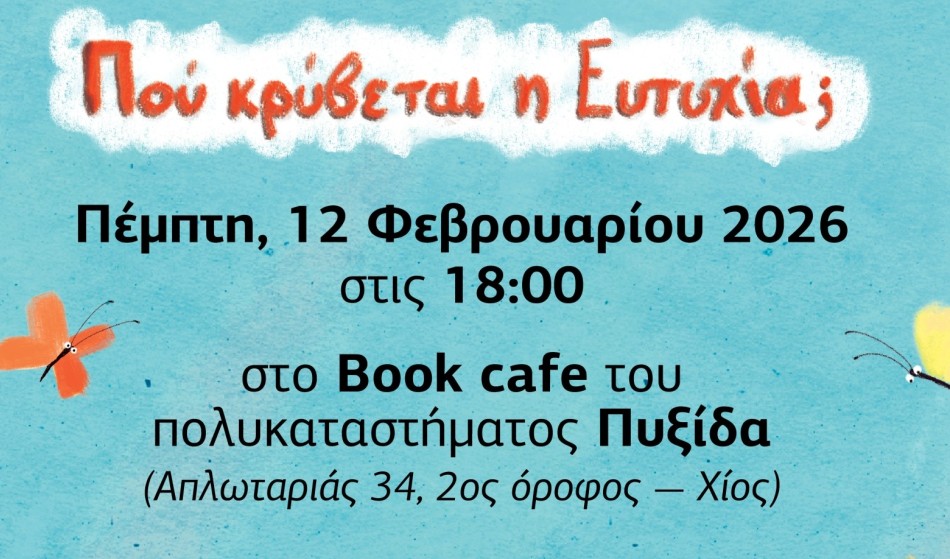 Το παιδικό βιβλίο της Ντένιας Πάτρα με τίτλο «Πού κρύβεται η Ευτυχία;» θα παρουσιαστεί την Πέμπτη 12 Φεβρουαρίου 2026, στις 18:00, στο Book Café του Πολυκαταστήματος Πυξίδα, σε μια εκδήλωση με ελεύθερη είσοδο και πλούσιο διαδραστικό περιεχόμενο.